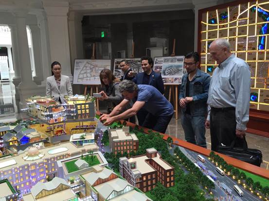 廣安置業(yè)營銷總監(jiān)沈紅梅一行向來訪人員介紹了項目的定位與特點,項目理念、設(shè)計細節(jié)以及富有民國特色的建筑風(fēng)格,得到了好萊塢電影大師的一致好評,紛紛饒有興趣的詢問相關(guān)信息、拍照留用。Jonathan Bollier表示北京坊項目令人驚艷,Phil Lengyel甚至開玩笑的表示希望能在北京坊擁有一間自己的辦公室。