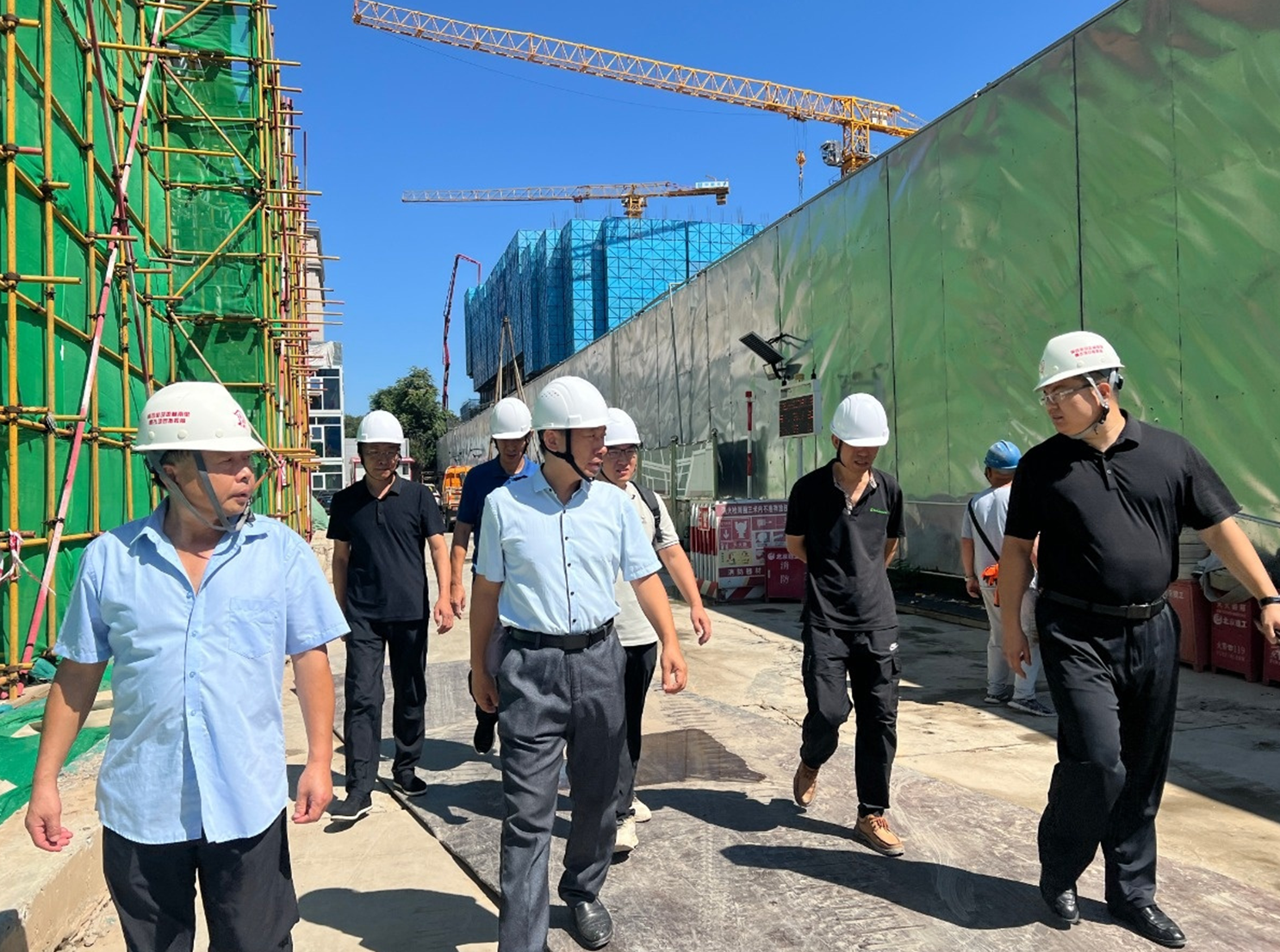 本次檢查主要針對現(xiàn)場各類施工機械的安全管理,并結(jié)合施工進度,對各類重大安全隱患進行風(fēng)險排查。檢查分為兩組開展,一組對B、C地塊塔吊上塔檢查,另一組對各地塊腳手架、模板支撐體系、施工動火作業(yè)、用電安全、消防安全、作業(yè)人員行為、勞動防護用品穿戴、施工升降機以及其他現(xiàn)場機械設(shè)備等方面進行檢查。